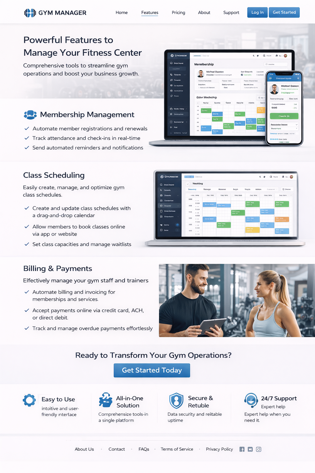 The system integrates member management, class scheduling, trainer assignments, billing,